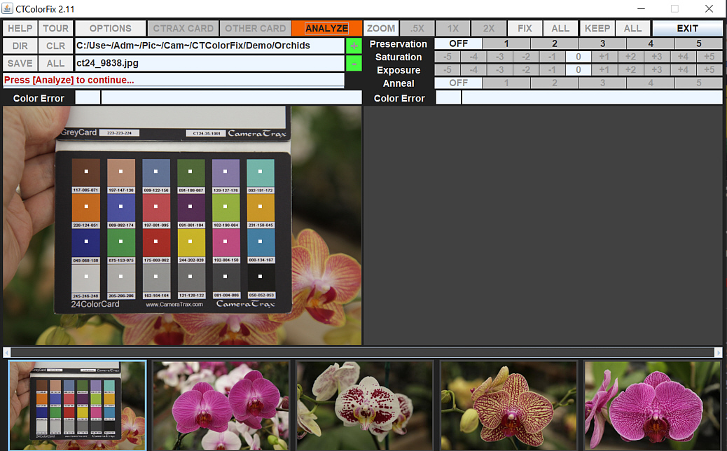 Color Analysis This screen-shot was take in the middle of performing a color analysis. The four 4 corners have been identified by mouse-click and graphical dots now mark all color patch locations. The [Analyze] button is highlighted and when invoked, the patch color data will be sent for analysis and the color-corrected image will appear. If the dot alignment is not ok, click the 4 corners again before clicking [Analyze]. ![]() |