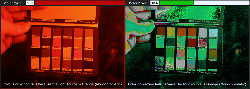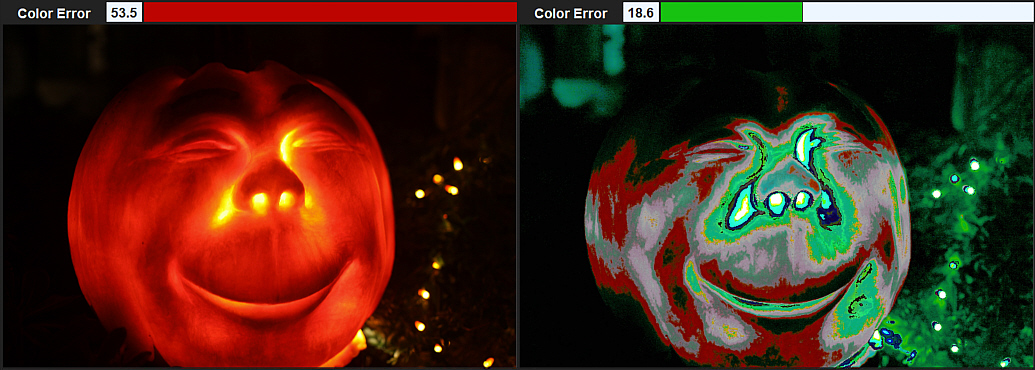 Bad Light The 'Pumpkin' Demo photos provide a stark example of extremely poor light. The only light source is from the pumpkin itself and is nearly a single color. Even with the color error dropping from 54 to 28, there is simply not enough colors in the spectrum, other than orange, to perform the analysis. ![]() So, while such photos can be artistic and entertaining, true color balance correction loses its meaning. ![]() |