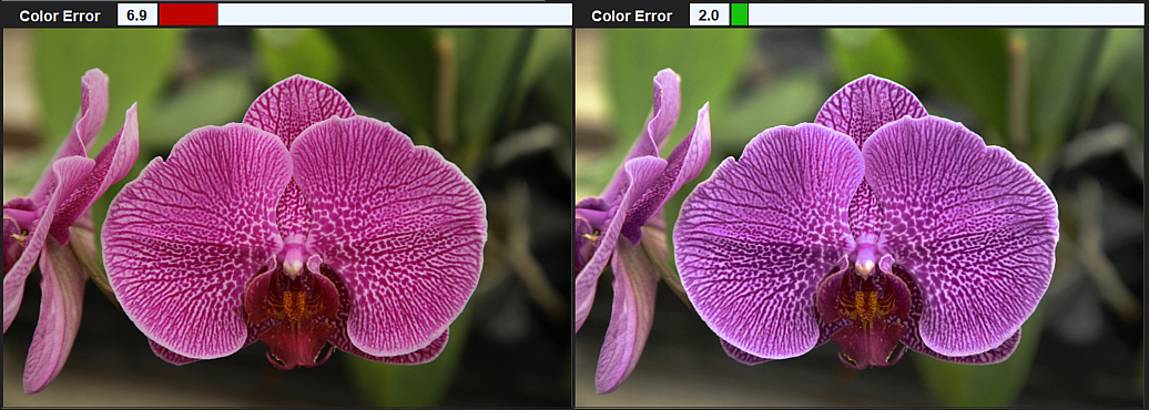 Orchids Flowers provide a very colorful subject and, in this instance, they are 'hot-house' grown. This means that while the light is subdued, it is uniform. Note that although the color error number is not particularly high, the improvement is significant. ![]() Clearly the color is much improved and more natural. What's not to like? ![]() |